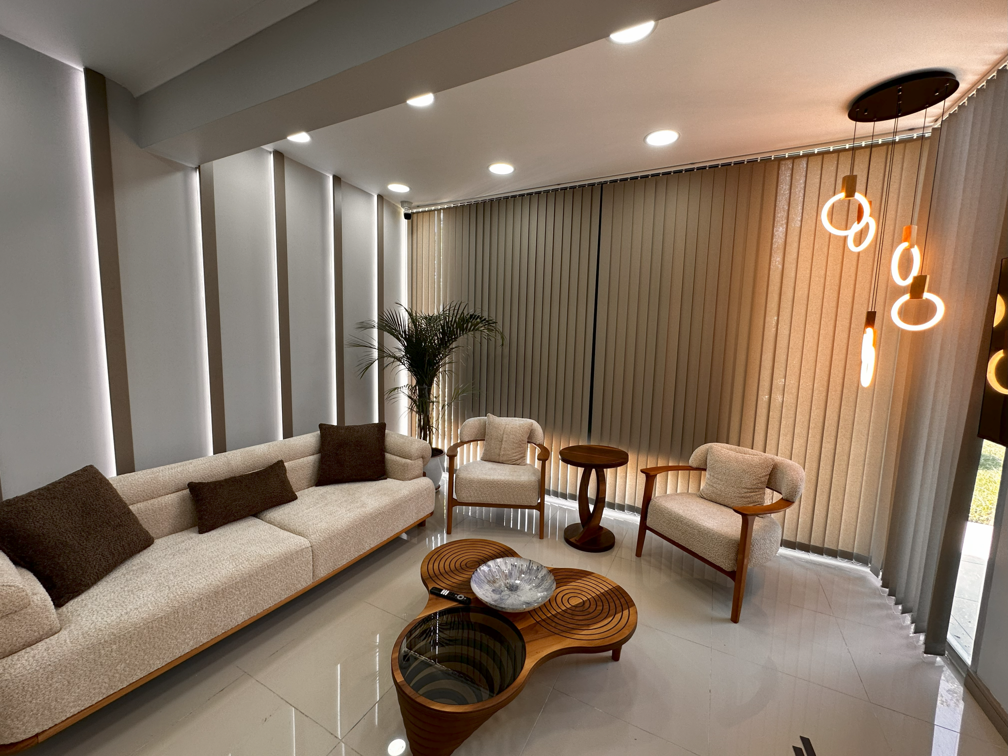 PalmsDent Diş Polikliniği’nin bekleme alanı, hastaların kendilerini rahat ve güvende hissedebilecekleri bir atmosfer yaratacak şekilde tasarlanmıştır. Modern diş polikliniği tasarımının en önemli unsurlarından biri olan bekleme alanı, doğal ışıkla aydınlatılarak ferah bir ortam sağlanmıştır. Ayrıca, rahat oturma alanları ve sıcak renk tonları kullanılarak, hastaların streslerini azaltmaya yönelik bir atmosfer yaratılmıştır. Bekleme alanının tam merkezinde yer alan karşılama bankosu, hem estetik hem de işlevsel açıdan özenle planlanmıştır. Modern diş polikliniği anlayışında önemli bir yer tutan bu alan, hastaların karşılanması ve bilgilendirilmesi sürecinde kritik bir rol oynamaktadır.